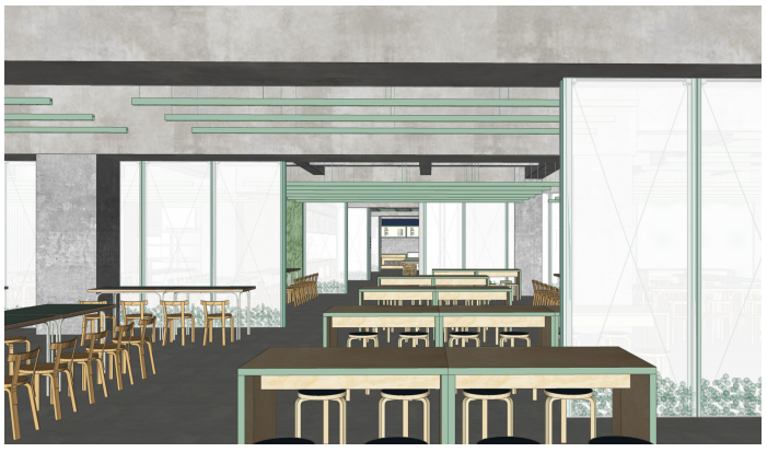 黄飞霞对于食堂这一空间的使用,有着自己的见解:“传统食堂往往是由一个大通间式的排布来满足排座率的需求并体现其社交公共性。可是,就高效的现代职场生活而言,就餐时间很短、食堂食物类型更为多样,又加之有社区人群的融入;因而大通间式的排布通过它尺度上的大和单一流线,制造的反而可能是一个相对嘈杂、流线拥堵、且有人群压迫感的用餐环境。”